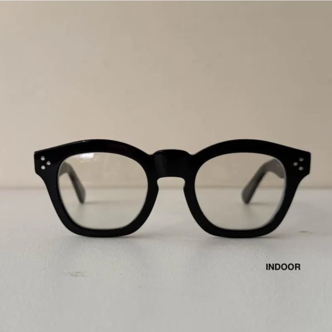 調光レンズによりレンズの色が変化するので室内ではクリアレンズの伊達眼鏡ver、室外ではブラウンレンズっぽアウトドアverに変化します。