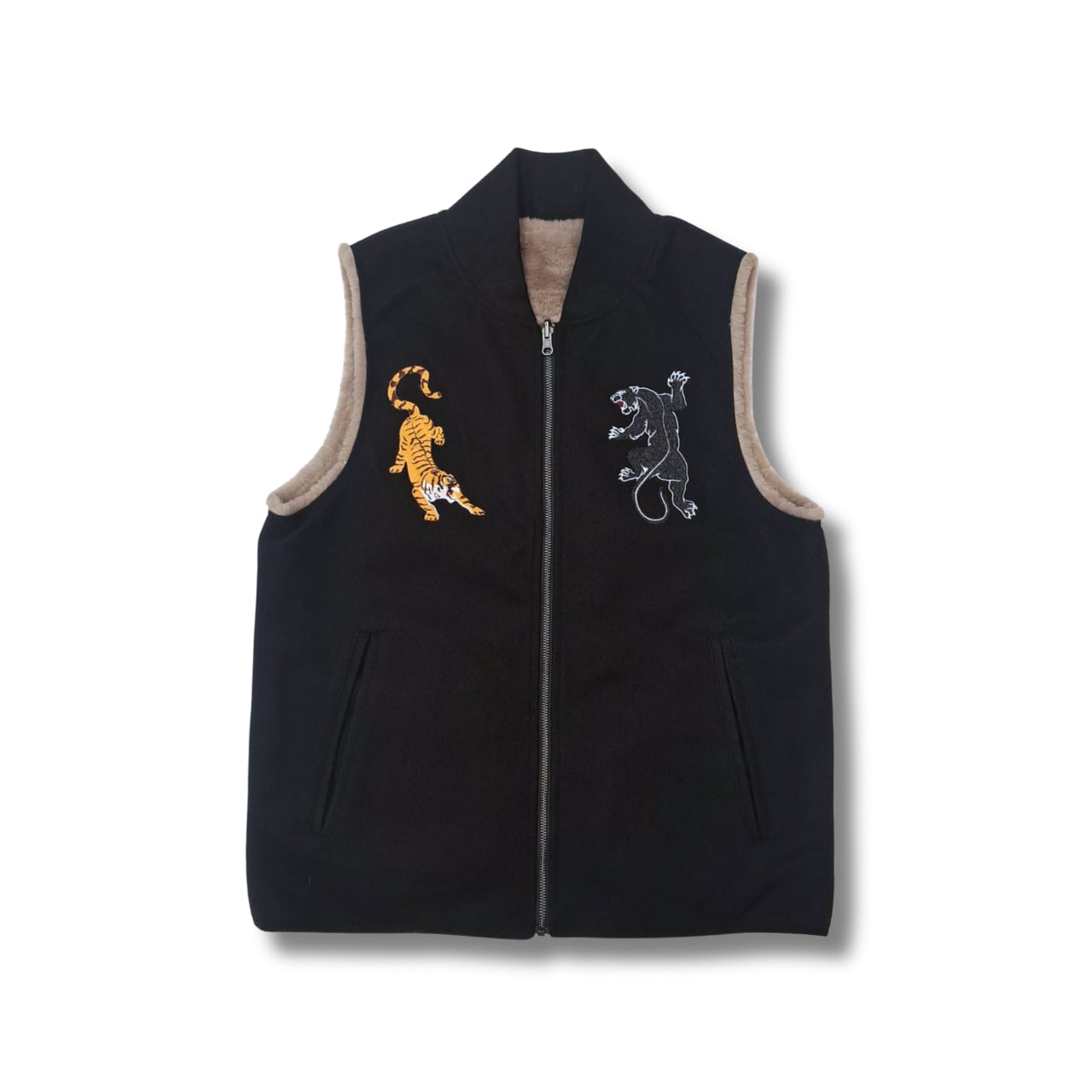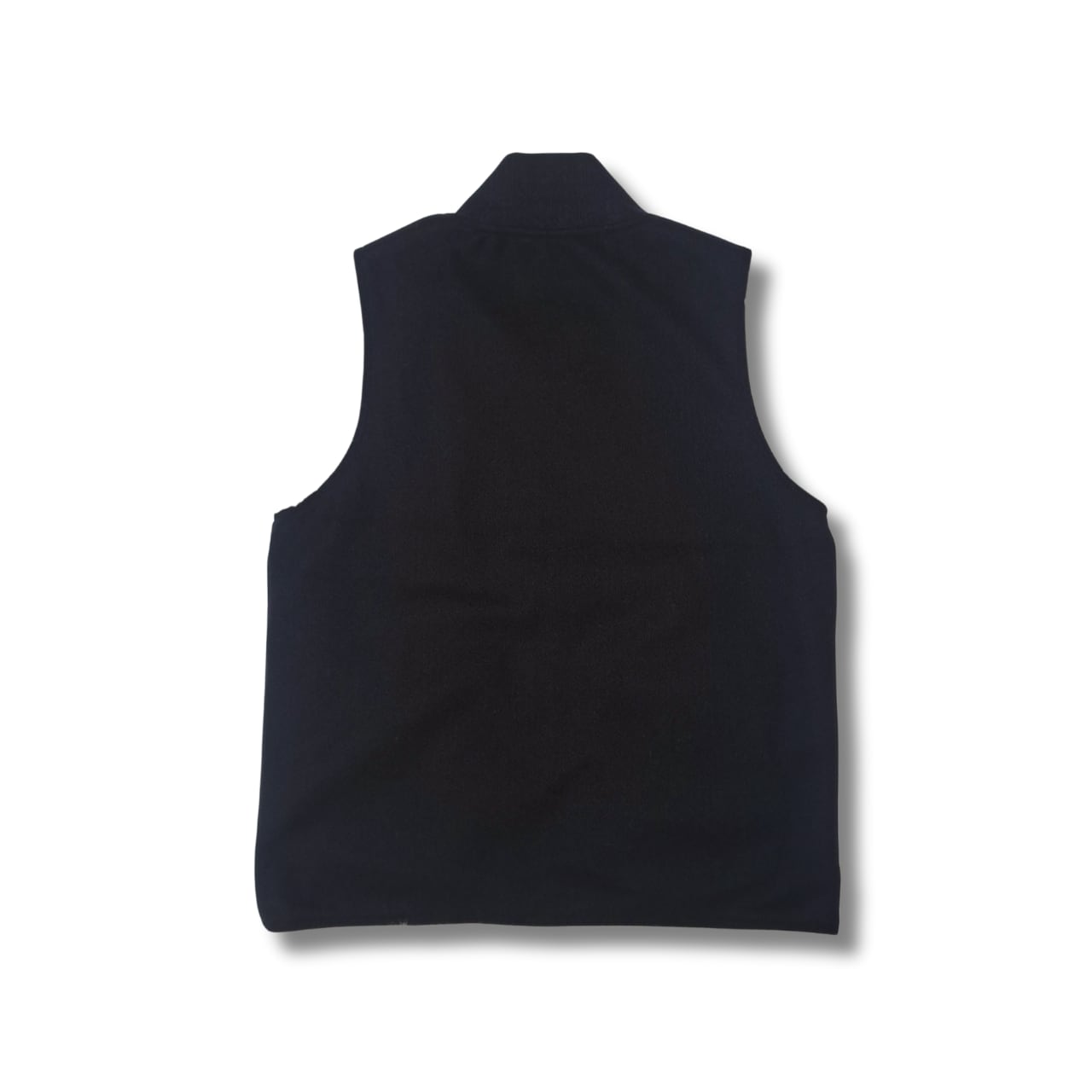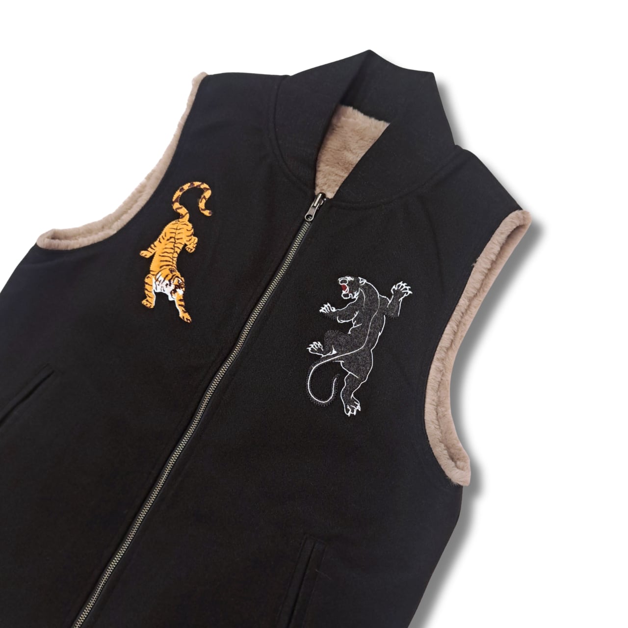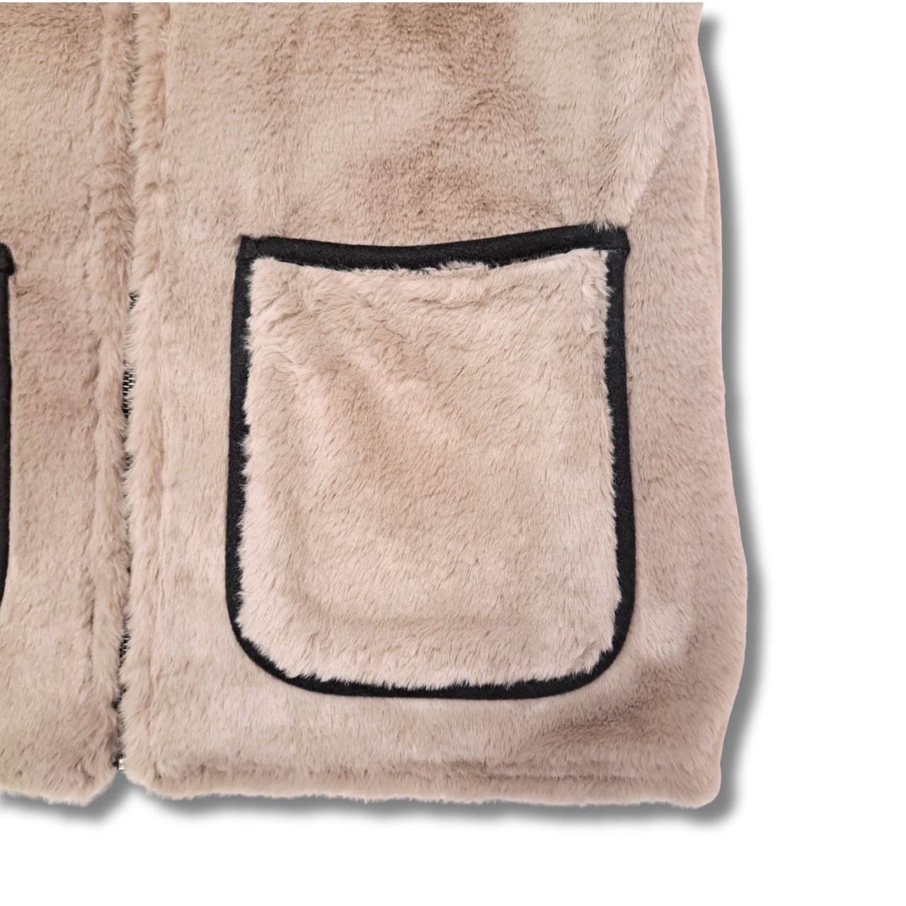 リバーシブルで着用でき、裏で着用するとポケットのパイピングがかわいいファーベストになります。