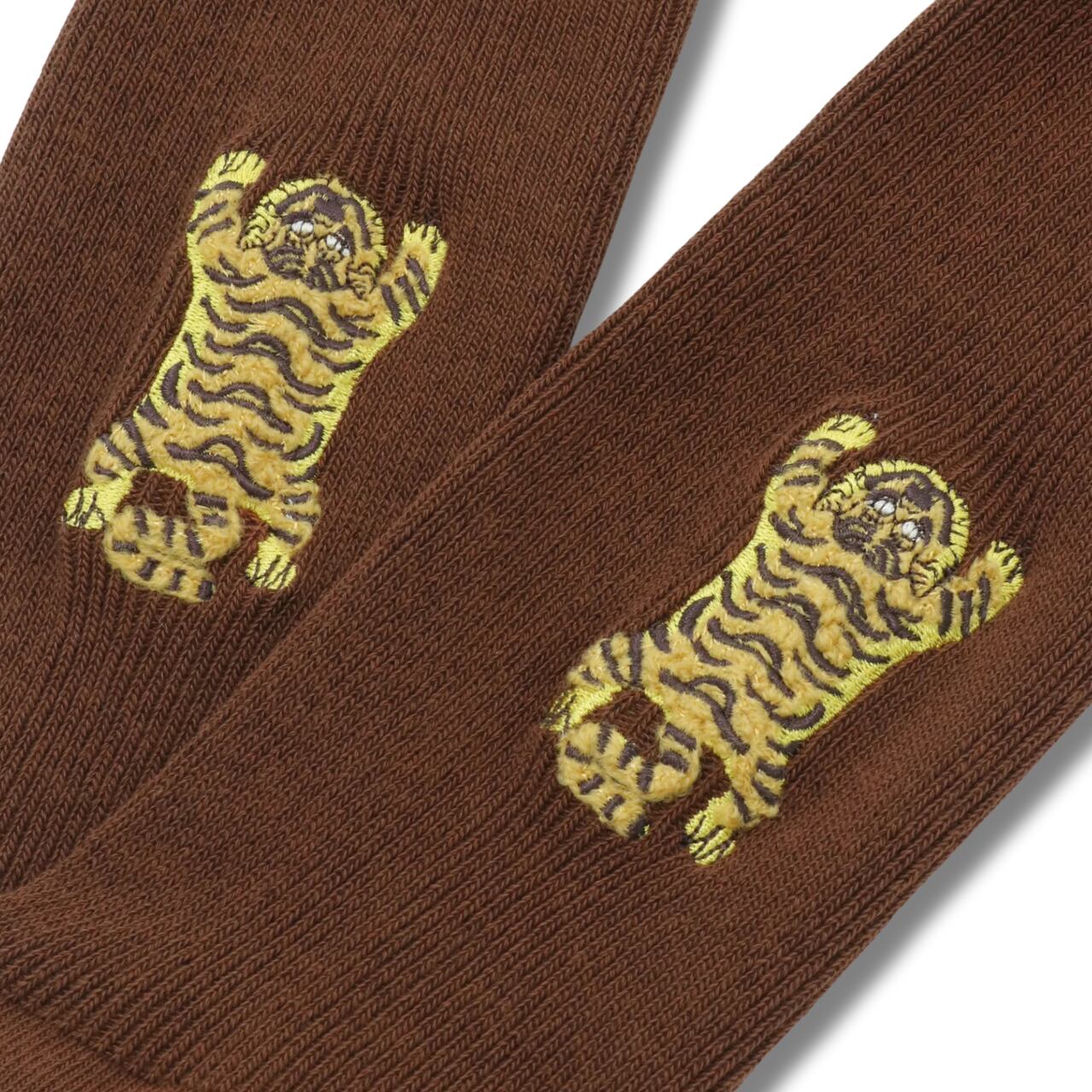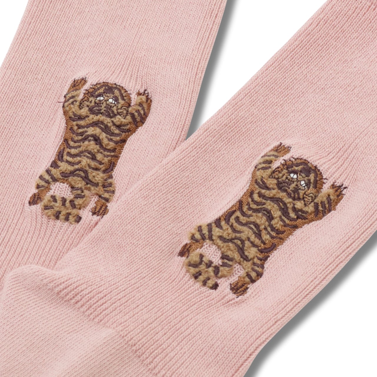 それぞれのソックスに施された虎の刺繍は、ふわふわとした毛並みのような質感で、まるで本物の虎を撫でているかのような愛らしい表情を見せています。