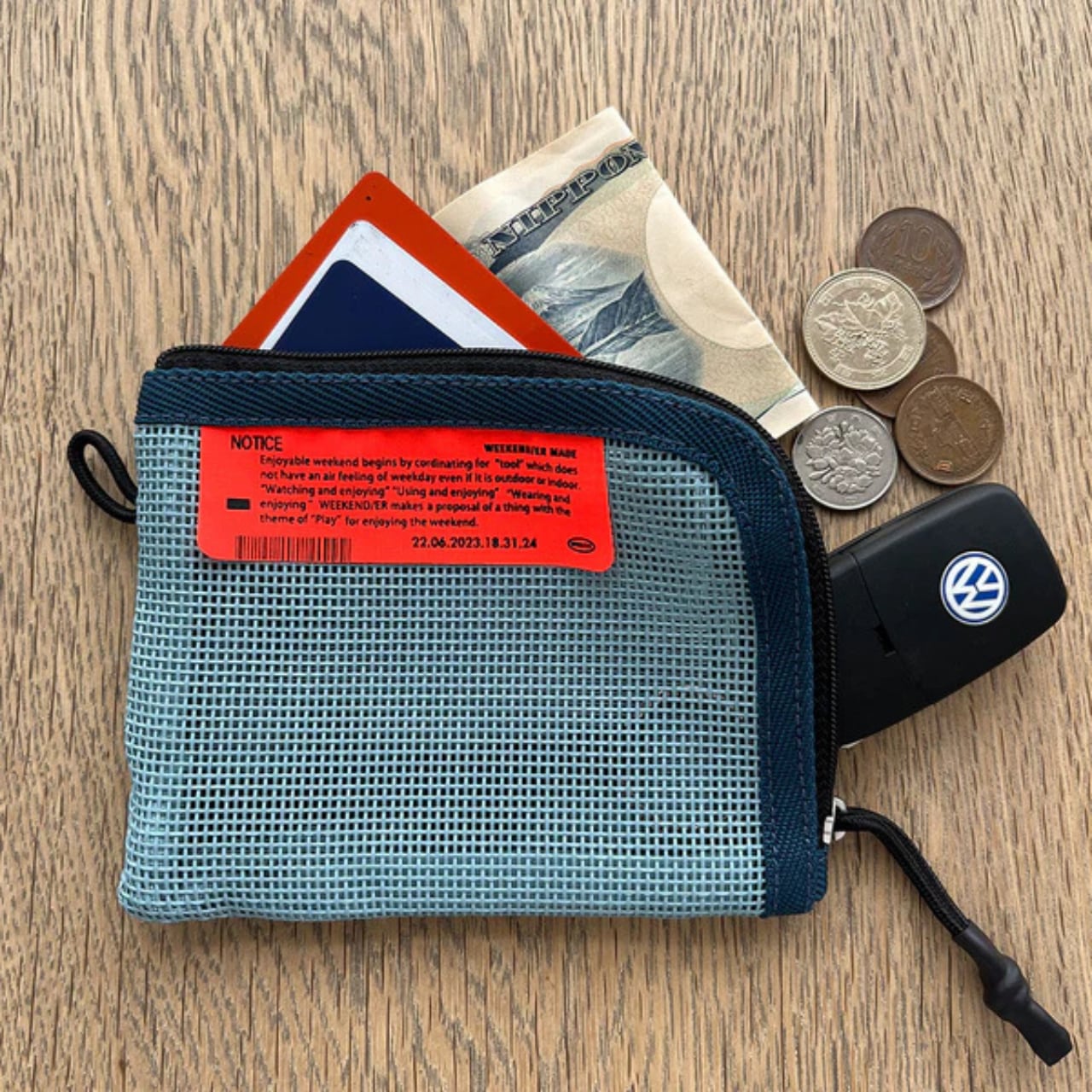 財布としても使える、塩ビでコーティングされた硬めのメッシュ生地を使用したマルチケースです。