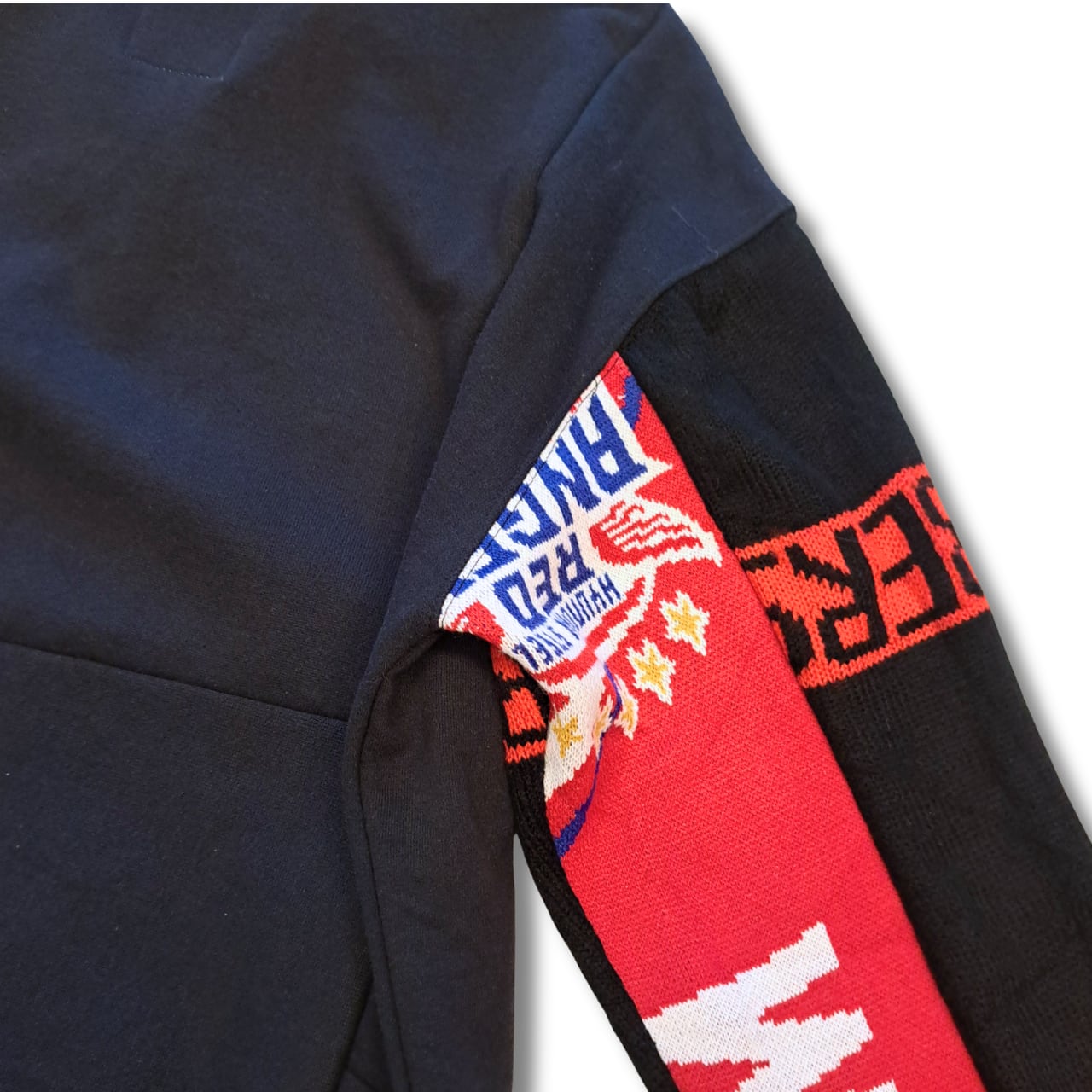 USEDのハーフジップスウェットに海外のフーリガンマフラーを袖としてドッキング。