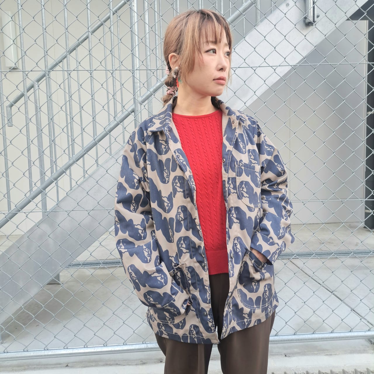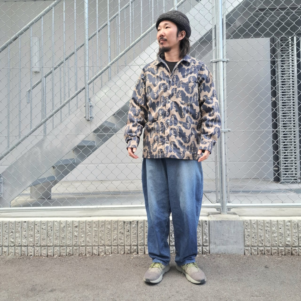 ワークウエアを総柄でポップにアレンジしたカバーオール。