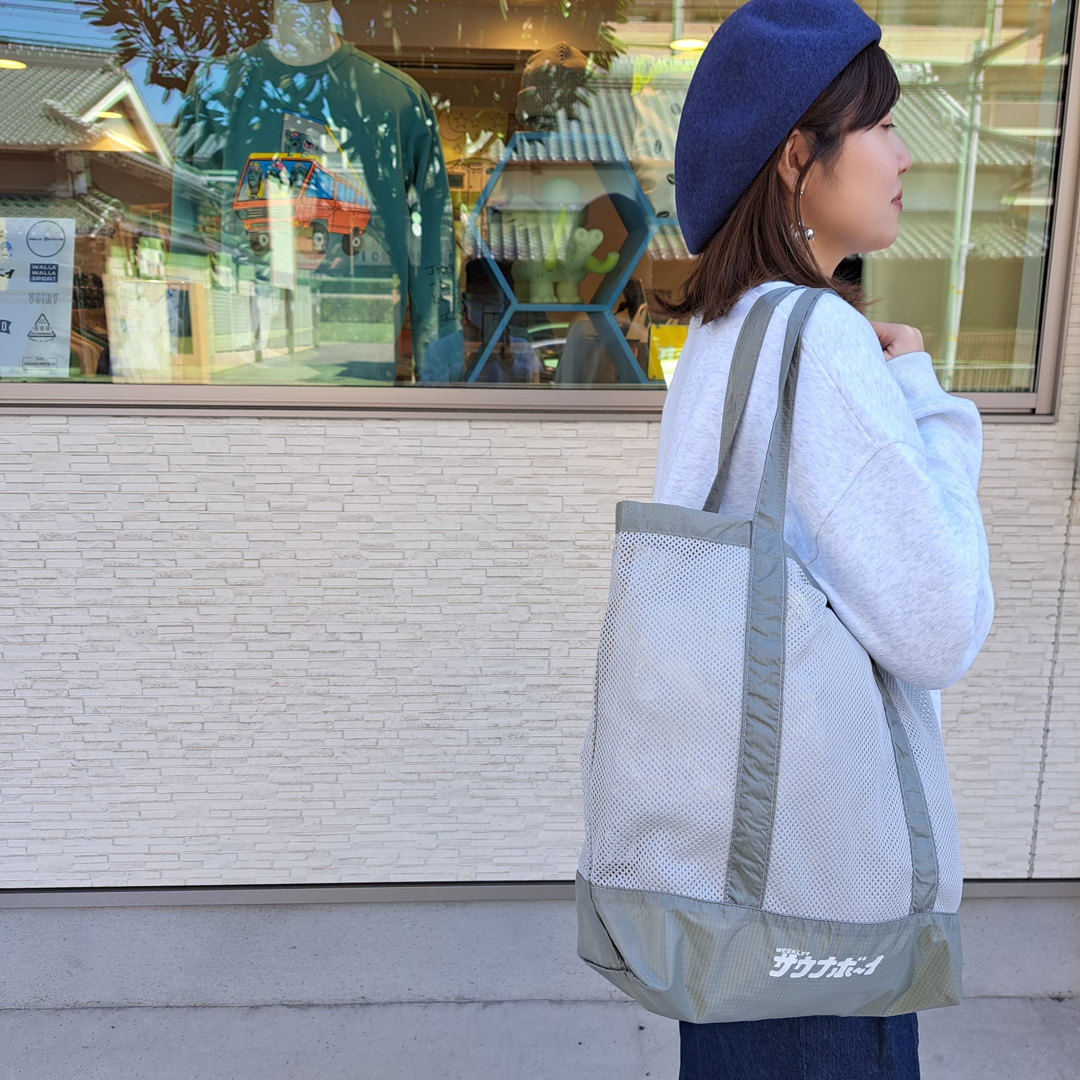 銭湯グッズをそのまま全部放り込めるメッシュショルダートートです。