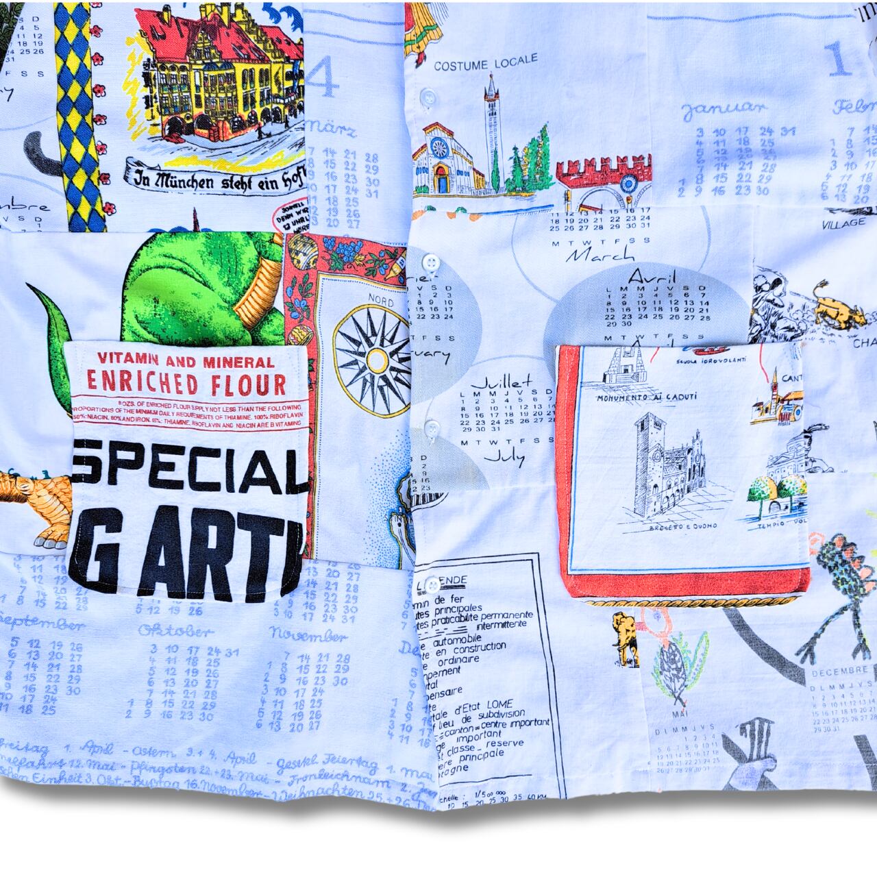 スーベニアタペストリーをランダムにパッチワークした長袖シャツ。